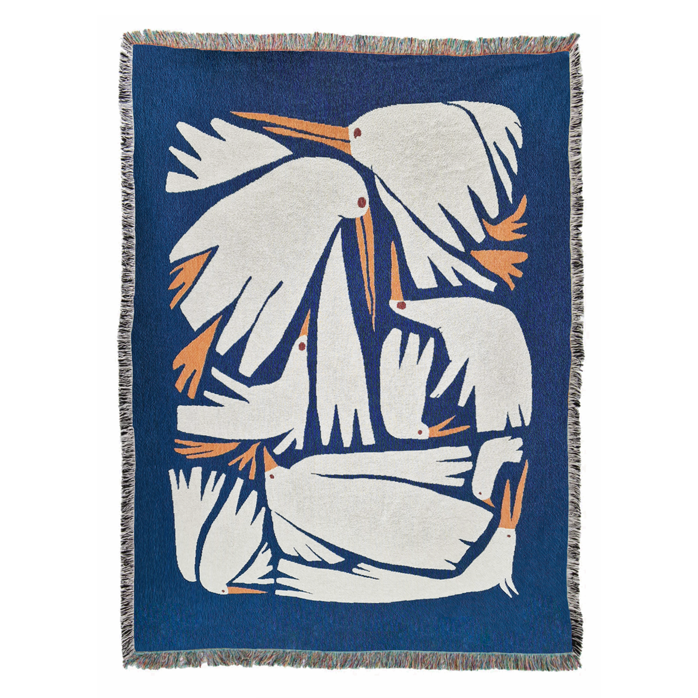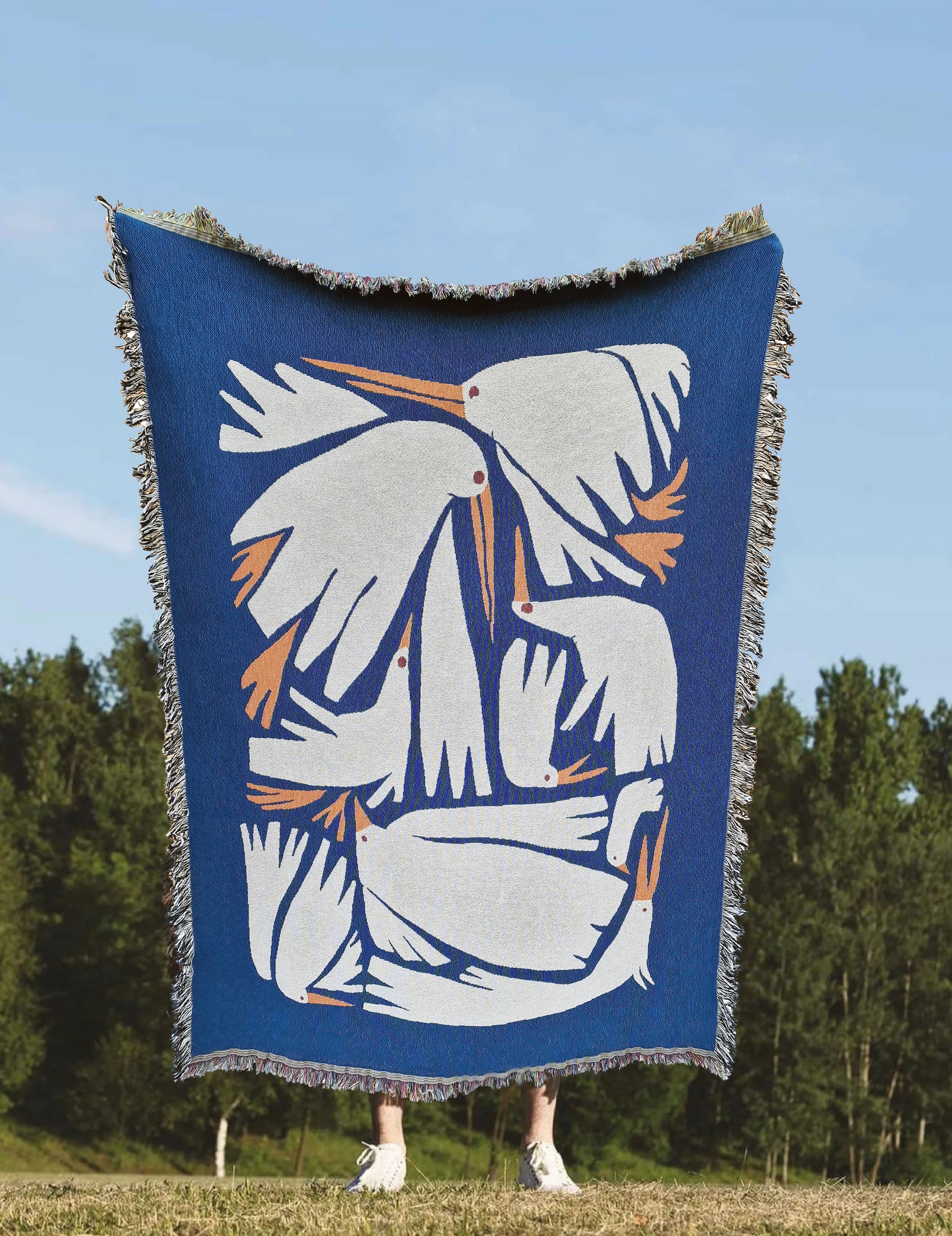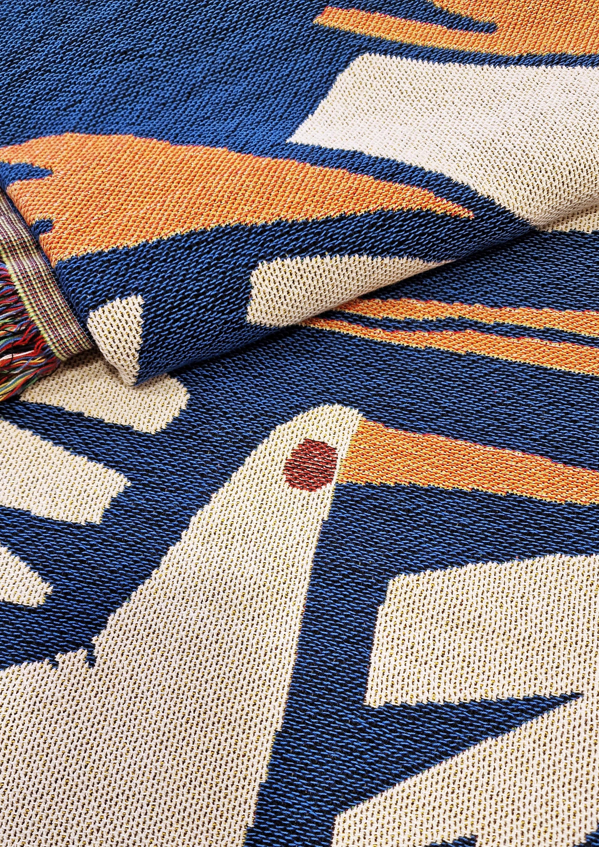 Birdie er designet av den norske kunstneren og illustratøren Renate Thor. Teppet er jacquardvevd i 100% økologisk bomull og kan brukes til alt du forbinder med et teppe. Det kan dessuten henges på veggen, enten med klesklyper, eller strukket opp med eller uten ramme.