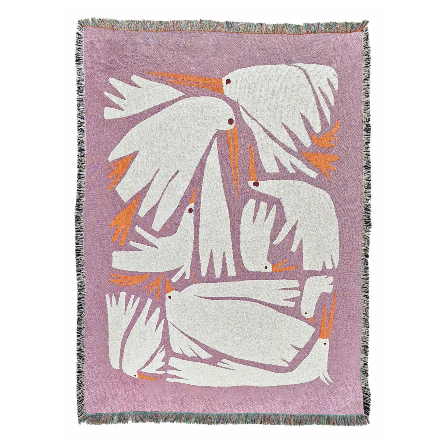 Paapur lanserer to nye jacquardvevde tepper/pledd (som kan strekkes, rammes inn og henges opp) i et begrenset opplag. Denne rosa utgaven av Birdie-motivet er hele 127x178cm, designet av Renate Thor i Oslo, og produsert i Sør-Carolina, USA.