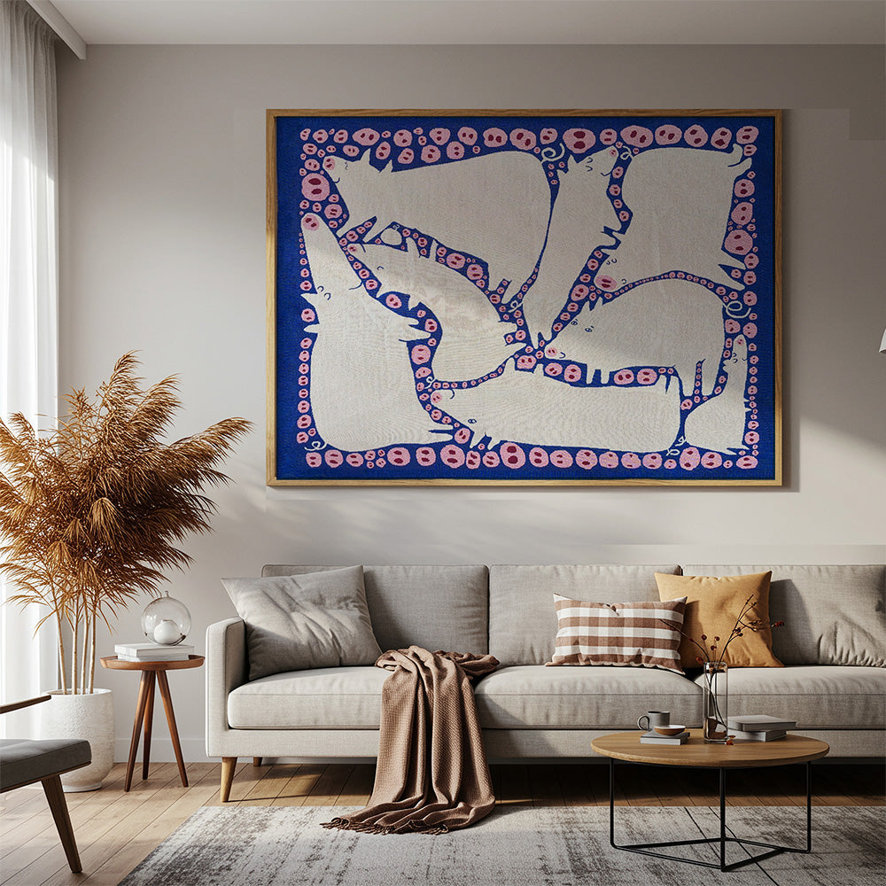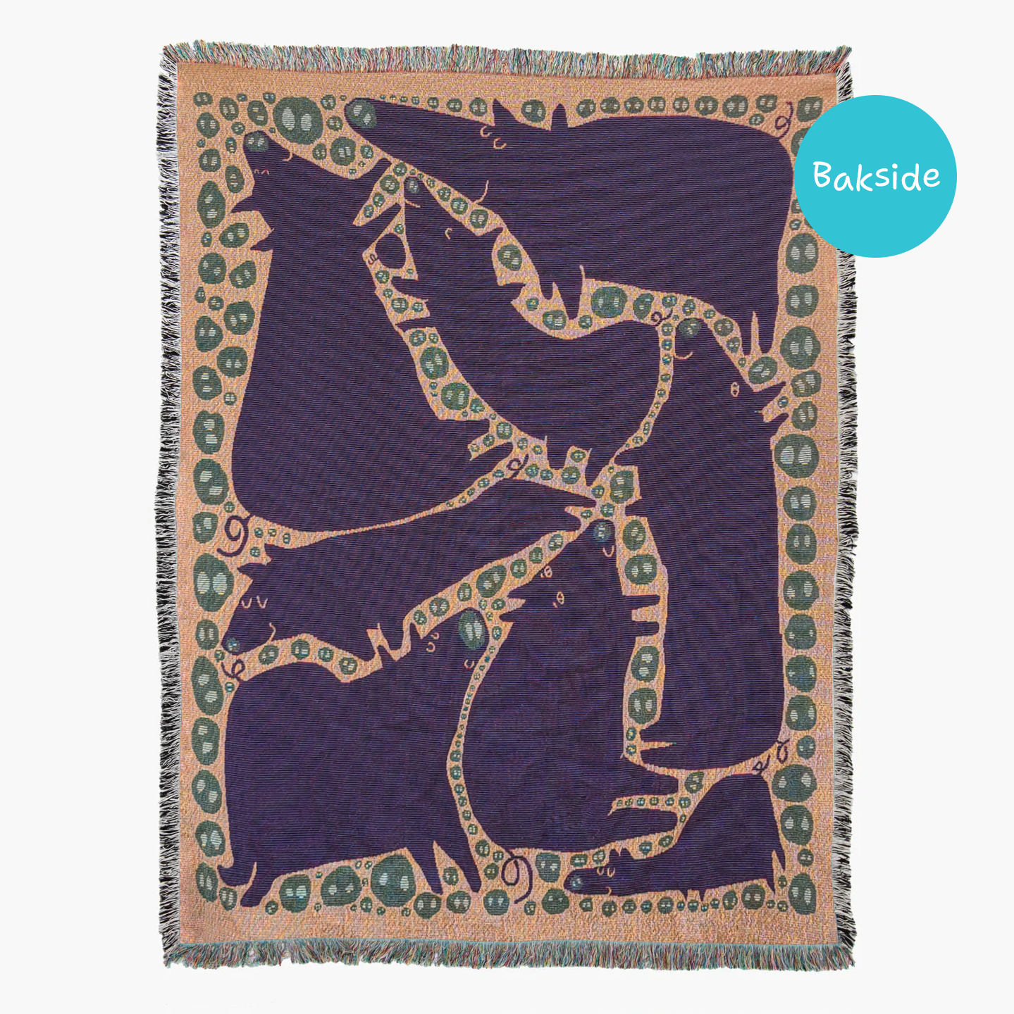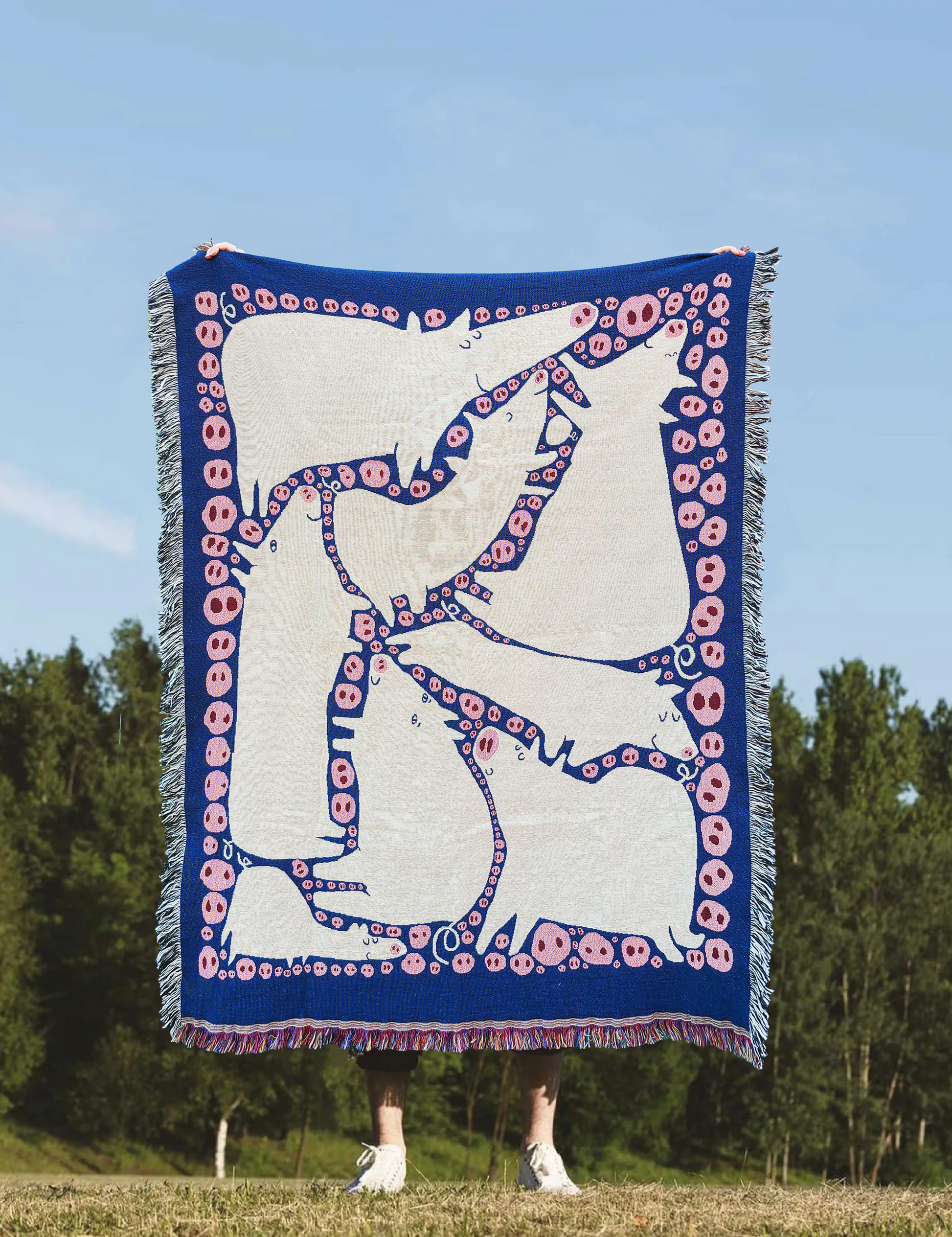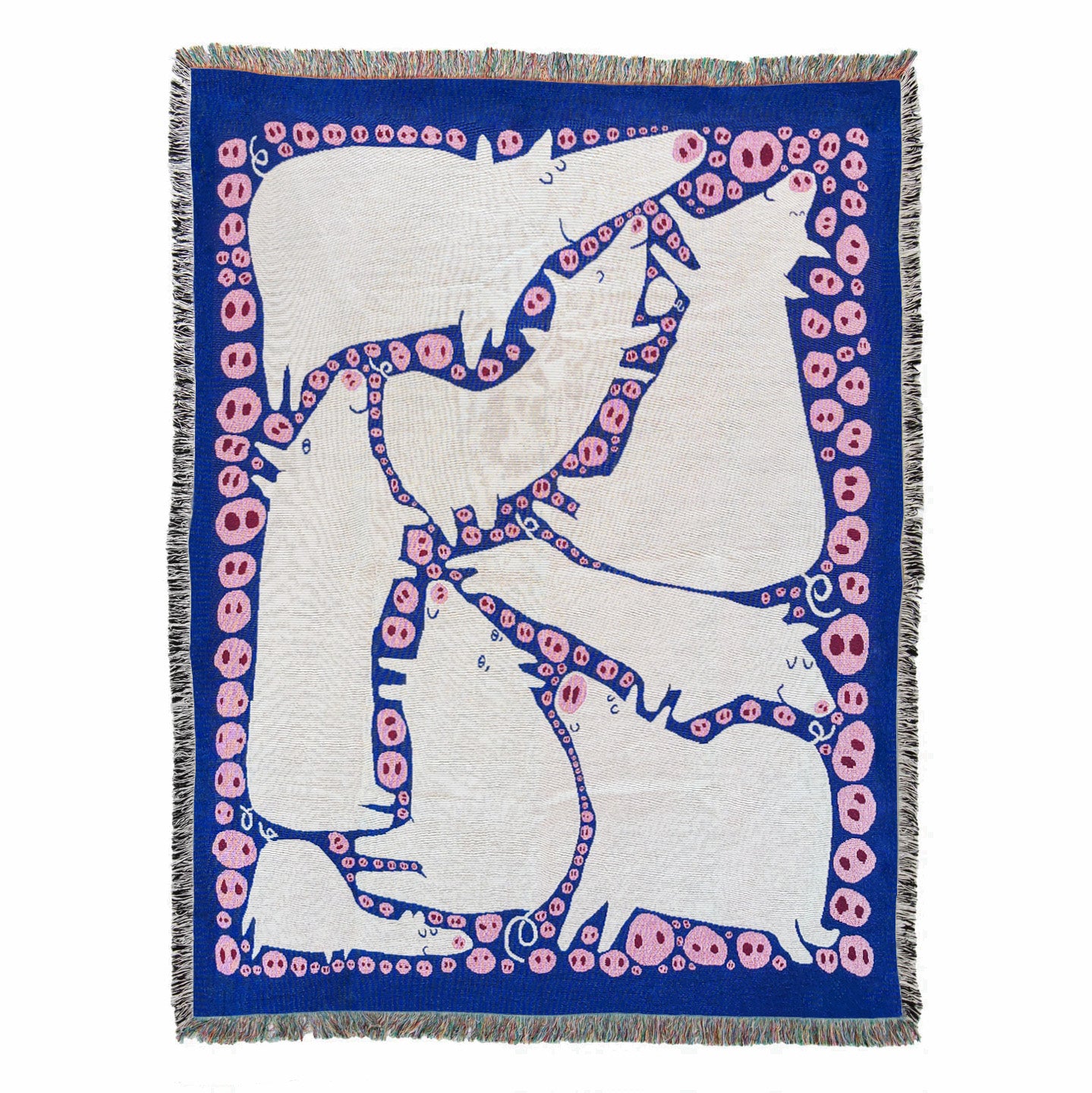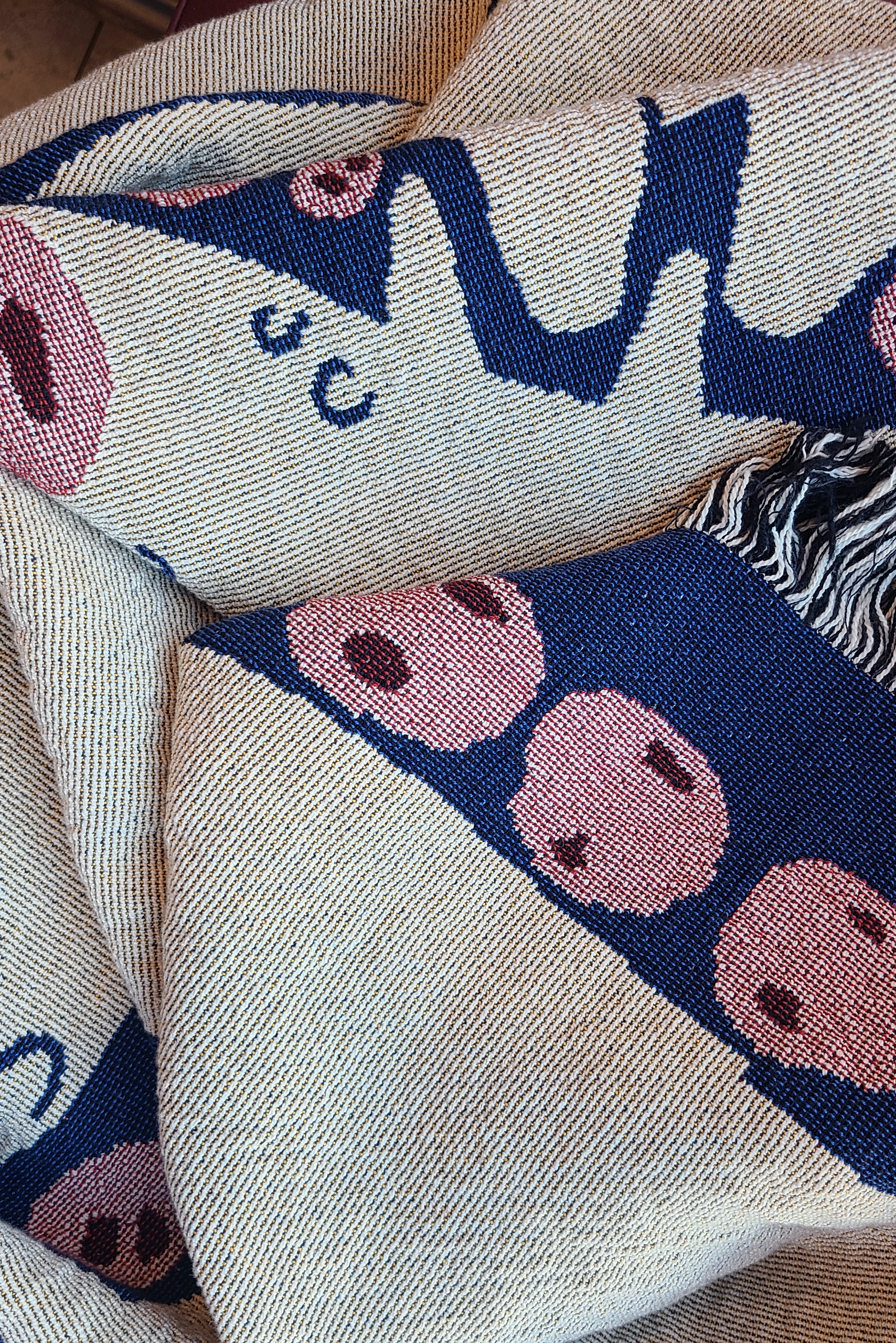 Det siste tilskuddet til vår kolleksjon av jaquardvevde tepper/pledd (som kan strekkes, rammes inn og henges opp) i begrenset opplag. Pigs er hele 127x178cm, designet av Renate Thor i Oslo, og produsert i Sør-Carolina, USA.
